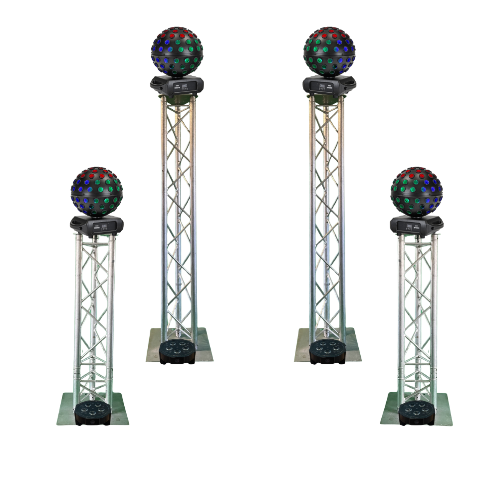 Deze indrukwekkende lichtset combineert hoogte en dynamische lichteffecten voor maximale impact op elk feest of evenement. De 4× Equinox Asteroid effecten zijn gemonteerd op een combinatie van truss totems van 200cm en 129 cm hoog, waardoor een speelse en professionele lichtopstelling ontstaat met diepte en variatie.