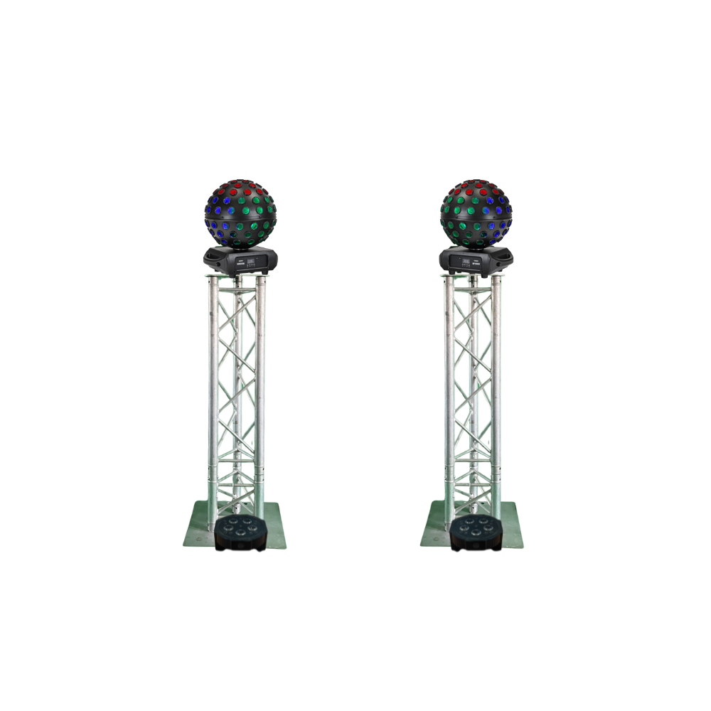 De 2× Equinox Asteroid lichteffecten zijn gemonteerd op stevige truss totems van 129 cm hoog, waardoor de bewegende lichtstralen mooi over de ruimte worden verspreid voor een echte party-beleving.